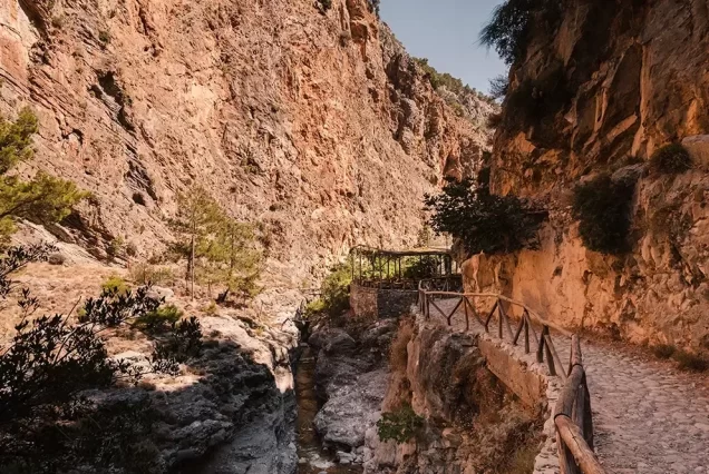 En explorant le paysage accidenté, les randonneurs rencontreront des ponts en bois enjambant de petits ruisseaux, tomberont sur des villages déserts et auront l’occasion de visiter la charmante chapelle d’Agios Nikolaos. La section la plus étroite des gorges, appelée « Portes de fer », est un passage impressionnant où les parois des gorges se rejoignent à une distance de quatre mètres seulement, atteignant des hauteurs de 300 mètres.